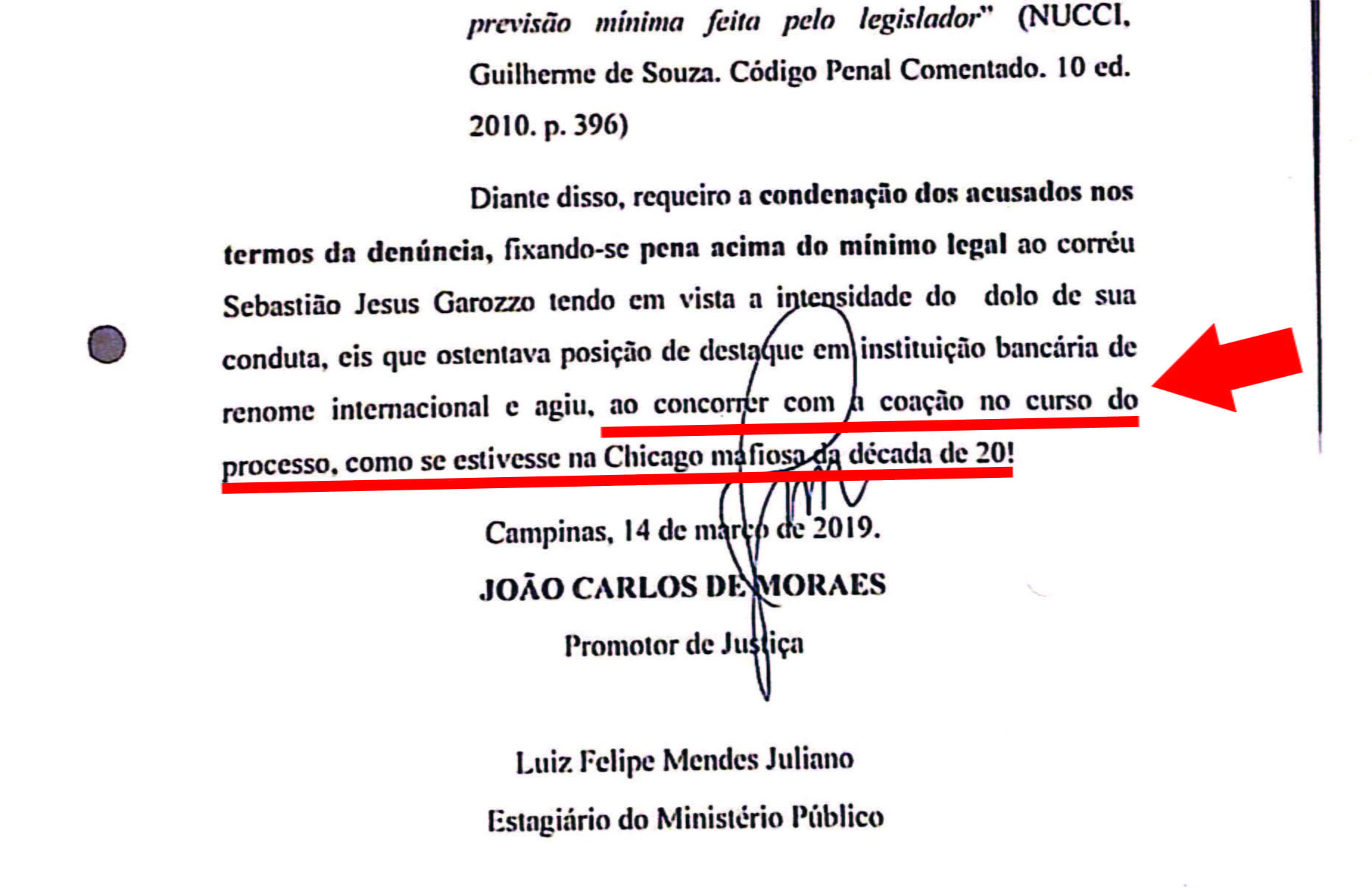 “Requeiro a condenação dos acusados, ao corréu Sebastião Jesus Garozzo, tendo em vista a intensidade do dolo de sua conduta. Eis que ostentava posição de destaque em instituição bancária de renome internacional e agiu, ao concorrer com a coação no curso do processo, como se estivesse na Chicago mafiosa da década de 20”, argumentou o promotor João Carlos ao pedir ao juiz da 2ª Vara Criminal de Campinas, Abelardo Silveira, a condenação de Sebastião.